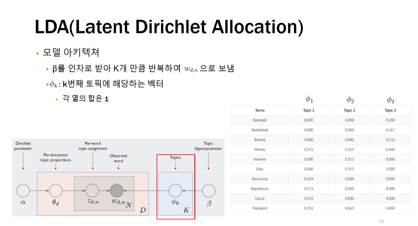 우선 글감 내지 주제를 정해야 합니다. 이후 실제 글을 작성할 때는 어떤 단어를 써야할지 결정합니다. LDA도 마찬가지입니다. 우선 말뭉치로부터 얻은 토픽 분포로부터 토픽을 뽑습니다. 이후 해당 토픽에 해당하는 단어들을 뽑습니다. 이것이 LDA가 가정하는 문서 생성 과정입니다.