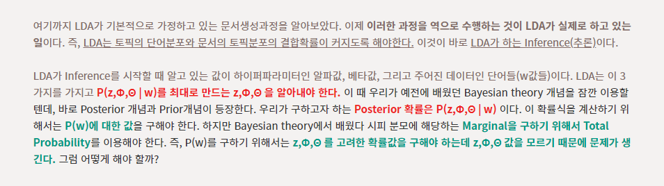 그런데 LDA는 이렇게 말뭉치 이면에 존재하는 정보를 추론해낼 수 있습니다. LDA에 잠재(Latent)라는 이름이 붙은 이유입니다. LDA의 학습은 바로 이러한 잠재정보를 알아내는 과정입니다.